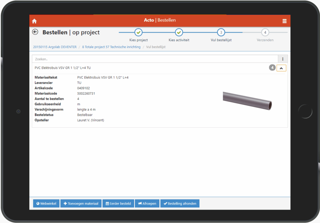 Moet je iets bestellen voor een specifieke werkorder? Dat kan snel en overzichtelijk met de Bestellen op Werkorders App. Je zoekt de juiste werkorder op, voegt het benodigde materiaal toe en stuurt de bestelling door. Alles wat je bestelt, wordt automatisch gekoppeld aan de juiste klus. Geen administratieve rompslomp meer achteraf.