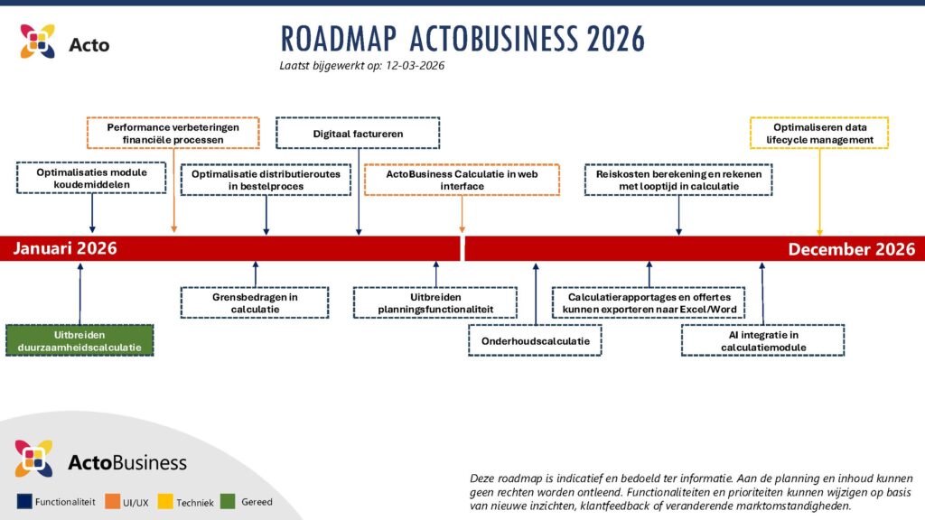 Disclaimer: De roadmap geeft een vooruitblik op geplande ontwikkelingen binnen ActoBusiness. De genoemde functionaliteiten zijn onder voorbehoud en kunnen tussentijds wijzigen op basis van voortschrijdend inzicht, prioriteiten en marktvraag. Aan de inhoud kunnen geen rechten worden ontleend.